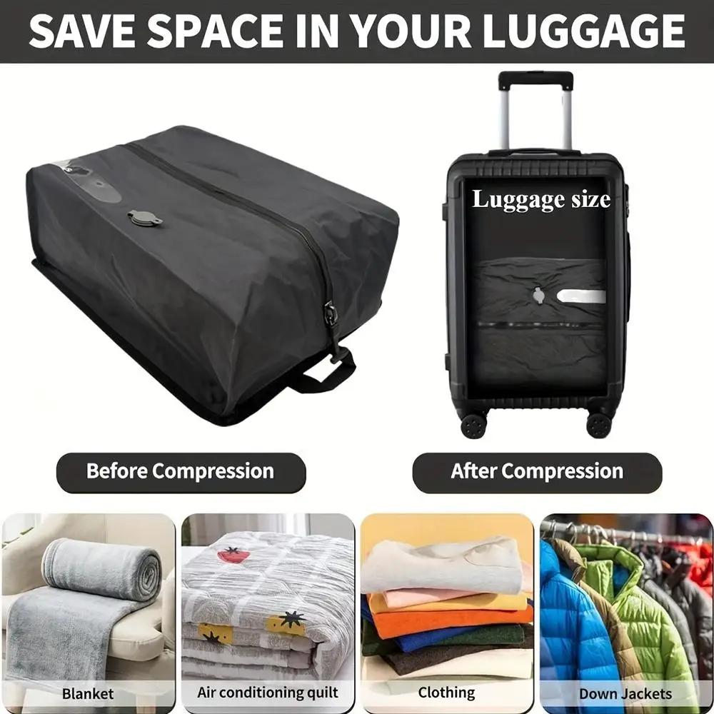Powerful storage space Compared with ordinary compression packing bags, these upgraded vacuum compression bags have excellent vacuum compression capabilities, which can reduce luggage space by up to 70%, compressing to 10% of the original size.
